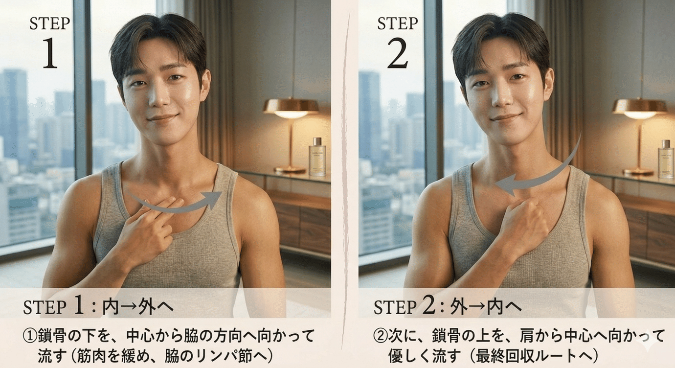 ②【外→内へ】 次に、鎖骨の上を、 肩から中心へ向かって優しく流す(最終回収ルートへ)。